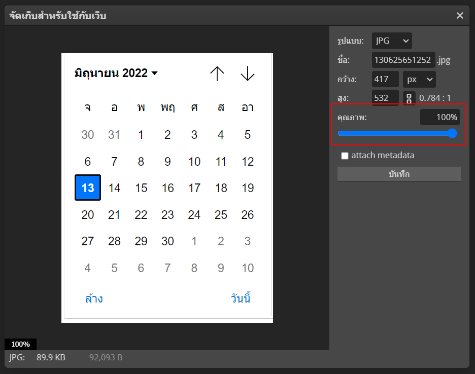 7. ขั้นตอนการ save รูปภาพ เมนูด้านบนเลือกไฟล์ > ส่งออกเป็น > ใหเลือกไฟล์นามสกุลที่ต้องการ เช่น JPG, PNG กำหนดคุณภาพ 100% และกดปุ่มบันทึก