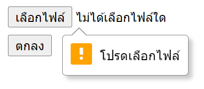 เช็คค่าว่าง input file จากตัวอย่างกำหนด required ไว้ที่ input type="file" เพื่อเช็คค่าว่าง กรณีถ้าผู้ใช้งานไม่ได้เลือกไฟล์ จะแสดงข้อความแจ้งเตือน “โปรดเลือกไฟล์” ที่หน้าเว็บไซต์ HTML
